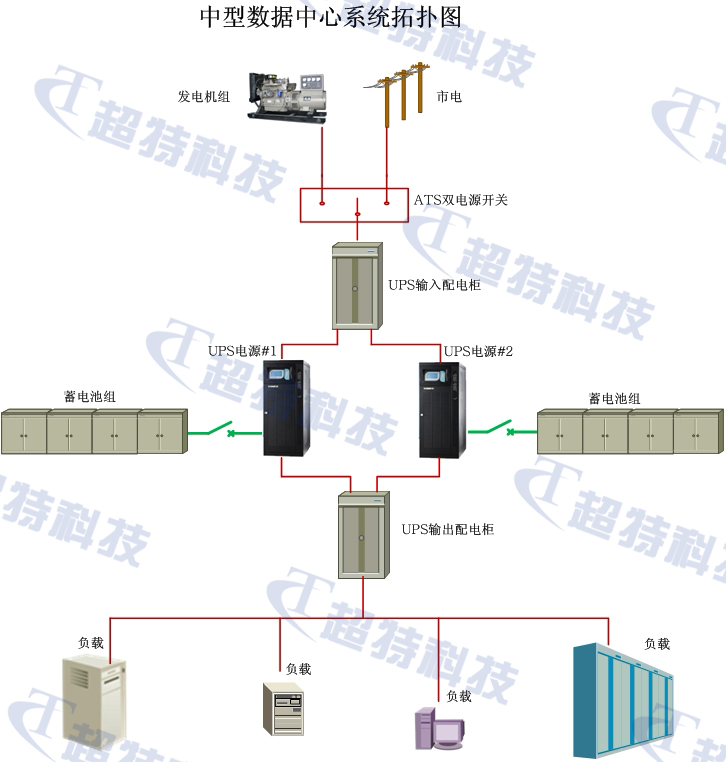 ????? 1、電源系統,通常選用多路市電源互為備份,并且機房設有專用柴油發電機系統作為備用電源系統,市電電源間、市電電源和柴油發電機間通過ATS(自動切換開關)進行切換,為數據中心內UPS(不間斷供電電源)、機房空調、照明等設備供電。